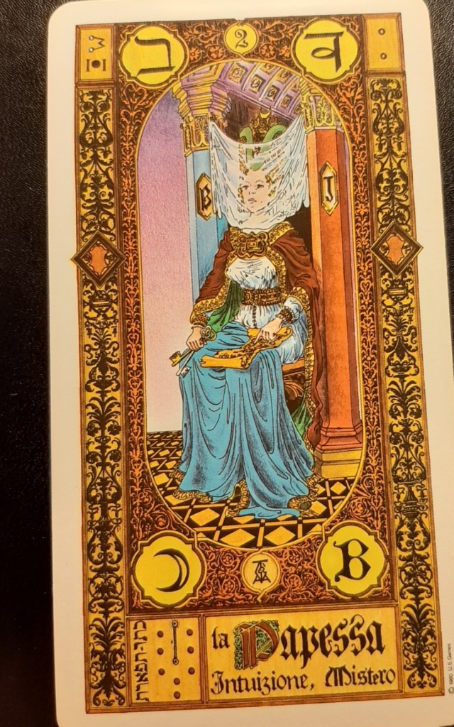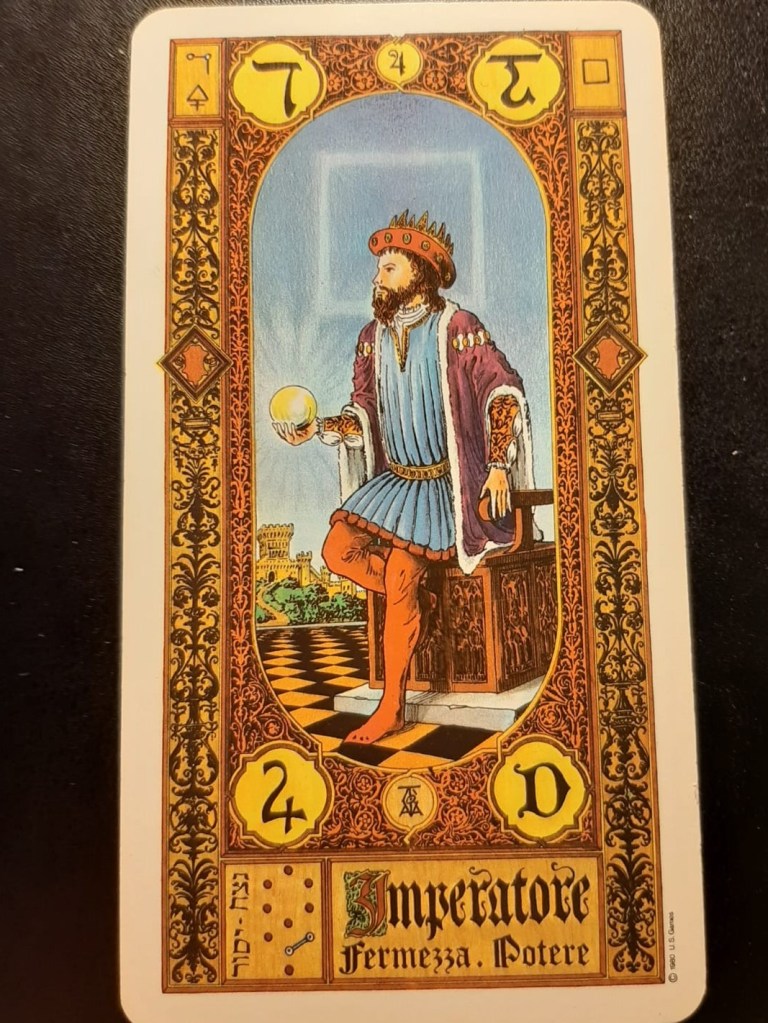 E’ stata un’esperienza nuova vedere il mio nome abbinato dalla sorte alla carta dell’imperatore e inizialmente sono rimasta sorpresa poi l’ho osservata: l’imperatore è un uomo con barba e baffi semi-seduto su un trono, sembra quasi pronto ad andarsene da un momento all’altro oppure pronto per intervenire in qualcosa. Ha sulla testa una pesante corona e abiti regali dove i colori predominanti sono l’azzurro, l’arancione e il rossiccio. Nella mano destra tiene una sfera raggiante che comunica luce, fiducia e sicurezza. Sembra non portare scarpe ma una morbida calzamaglia. Sugli angoli della carta si notano dei simboli che non so interpretare, si riconosce il 4 ( come i lati del quadrato ); sul fondo sotto la scritta IMPERATORE due più piccole: fermezza . Potere. (aggiungerei razionalità).