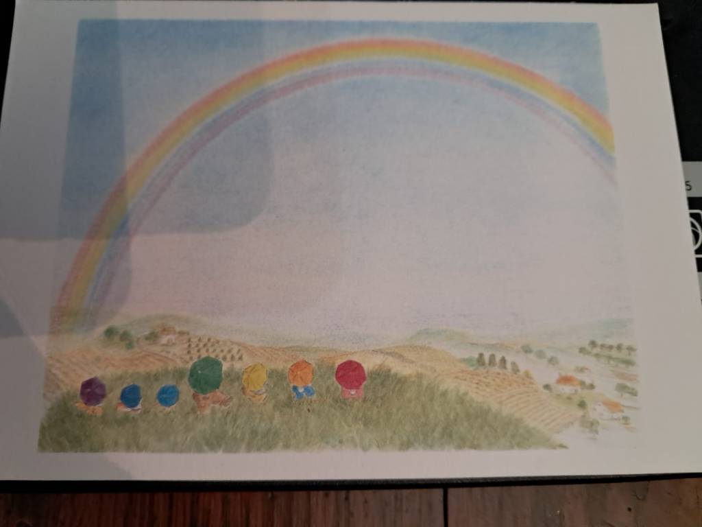 L’immagine dell’arcobaleno, del prato e dei colori sul fondo del biglietto, realizzato con mano leggera, sembra a matita o acquerello, mi ha riportato a lei, la Fata del bosco.